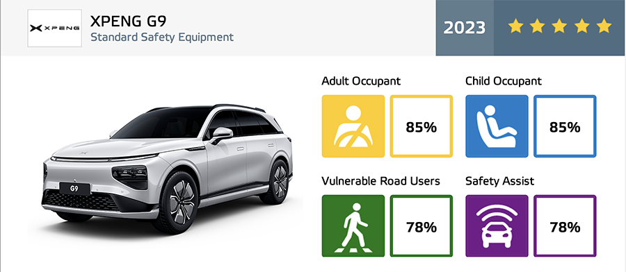 Xpeng G9 เปิดตัวในยุโรปในเดือนกันยายน ถูกทดสอบ Crash-Test โดย EuroNCAP โดยได้รับ 5 ดาวได้คะเเนนสูงสุดในประเภท Adult Occupant เเละ Child Occupant ได้ 85% ส่วนประเภท Vulnerable Road Users เเละ Safety Assist ได้ 78% ในการทดสอบ EuroNCAP เเสดงให้เห็นว่า G9 มีระบบรักษาความปลอดภัยที่ดีโดยรวม