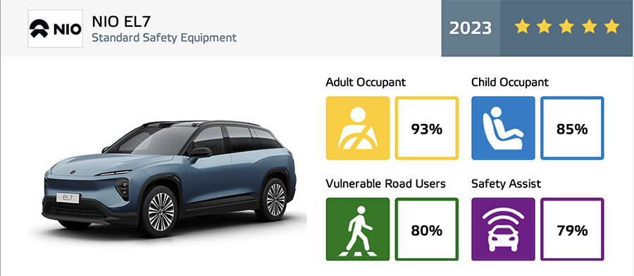 Nio EL7 เป็นรถยนต์ SUV ระดับไฮเอนขนาดกลางที่สามารถถอดเปลี่ยนเเบตเตอรี่ได้เเทนการจอดชาร์จ ในประเทศจีนขายภายใต้ชื่อ ES7 เเต่ Nio ถูกบังคับให้เปลี่ยนชื่อโดยทาง Audi เพื่อหลีกเลี่ยงผลกระทบในการใช้ชื่อคล้ายกัน ในการทดสอบ EL7 ได้คะเเนนสูงสุดในประเภท Adult Occupant 93% ในหมวด Child Occupant ได้ 85% ส่วน Vulnerable Road Users ได้ 80% เเละ Safety Assist ได้ 78%