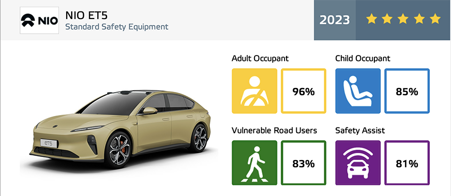 Nio ET5/ET5 Touring ดูเหมือนจะเป็นรถจีนที่ปลอดภัยที่สุดที่ประเมินโดย EuroNCAP ในปี 2023 ในการทดสอบ Adult Occupant ได้คะเเนนสูงถึง 96% ส่วน Child Occupant ได้ 85% ในการทดสอบ Vulnerable Road Users ได้ 83% เเละ Safety Assist ได้ 81%