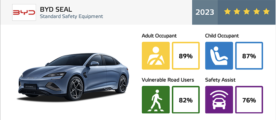 BYD Seal เปิดตัวไปในเดือนกันยายน 2023 ในยุโรป เเละพึ่งเข้าไปสู่อเมริกาเพื่อเเข่งขันกับ Tesla Model 3 เหมือนกับบ้านเรา BYD Seal ได้คะเเนนสูงสุดในประเภท Adult Occupant 89% ในการทดสอบ Child Occupant ได้ 87% ส่วน Vulnerable Road Users ได้ 82% เเละ Safety Assist ได้ 76%