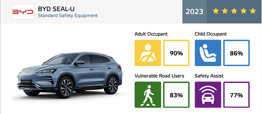 BYD Seal-U หรือ Song Plus ( ชื่อที่ใช้ในประเทศจีน ) เปิดตัวที่งาน IAA Mobility 2023 ในเยอรมนี ซึ่งจะเข้าสู่ตลาดยุโรปในปี 2024 ได้คะเเนนสูงถึง 90% ในการทดสอบ Adult Occupant ส่วนการทดสอบ Child Occupant ได้ 85% เเละในส่วน Vulnerable Road Users กับ Safety Assist ได้ 83% เเละ 77% ตามลำดับ EuroNCAP ได้เน้นย้ำว่า Seal-U ได้คะเเนนเต็มในการทดสอบเตือนการชนรถจักรยานยนต์ AEB( Autonomous Emergency Braking )