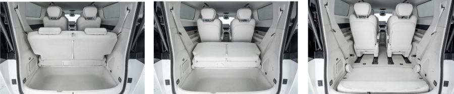ภายในจะมาพร้อมทางเลือกเบาะนั่งทั้งในรูปแบบ 6 และ 8 ที่นั่ง โดยหากเลือกแบบ 8 ที่นั่ง จะไม่ใช่การติดตั้งเบาะแบบ 3 แถวเหมือนรถ MPV ทั่วไป แต่ด้วยความยาวของตัวถังกว่า 5.3 เมตร จึงทำให้สามารถบรรจุเบาะนั่งได้มากสุดถึง 4 แถว โดยเบาะนั่งแถวที่ 4 จะสามารถพับเก็บไว้ที่พื้นตัวรถได้โดยไม่รบกวนพื้นที่ห้องเก็บสัมภาระแต่อย่างใด ขณะที่แถว 3 จะถูกออกแบบให้มีพื้นที่วางขาและการใช้งานที่กว้างขวางกว่ารถ MPV ทั่วไป เนื่องด้วยการใช้ SOA (Space Oriented Architecture) ที่มีความเป็นฝาแฝดกับ SEA แต่ได้เน้นการพัฒนาไปที่รถยนต์เพื่อการพาณิชย์เป็นหลัก ทั้งในรูปแบบรถตู้โดยสารและรถตู้ทึบขนสัมภาระ