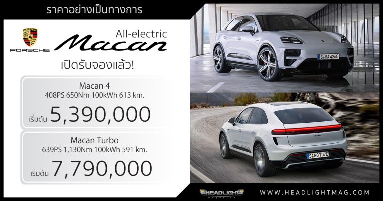 ราคาอย่างเป็นทางการ Porsche Macan Electric Macan 4 Elec … อ่านเพิ่มเติม ราคาอย่างเป็นทางการ Porsche Macan Electric : เริ่มต้น 5,390,000 – 7,790,000 บาท | รถยนต์ไฟฟ้า 100%