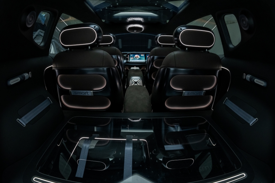 Smart ยังได้ติดตั้งเบาะนั่งคู่หน้าที่มาพร้อมฟังก์ชั่นเบาะนวดไฟฟ้า และออกแบบตามหลักสรีรศาสตร์เพื่อความสบายสูงสุดยามเดินทาง พร้อมด้วยฟังก์ชั่นการระบายความร้อนและติดตั้งแผ่นรองน่อง ขณะที่ลำโพงแบบถอดออกไปใช้งานภายนอกตัวรถได้ก็ถูกติดตั้งมาให้ในลักษณะเดียวกับที่ Toyota เลือกใช้ JBL กับรถ SUV ในตลาดมะกัน พร้อมกันนี้ยังมีผู้ช่วยส่วนตัวที่ทำงานบนระบบ AI และการสั่งงานด้วยเสียง เติมเต็มบรรยากาศภายในห้องโดยสารด้วยไฟตกแต่ง ambient ligh