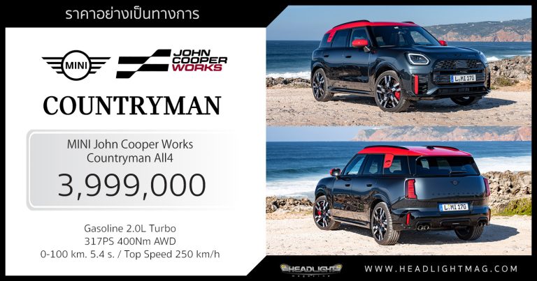 ราคาอย่างเป็นทางการ All NEW MINI John Cooper Works COUN … อ่านเพิ่มเติม ราคาอย่างเป็นทางการ All NEW MINI John Cooper Works COUNTRYMAN : 3,999,000 บาท | เบนซิน 2.0 Turbo 317 แรงม้า ALL4