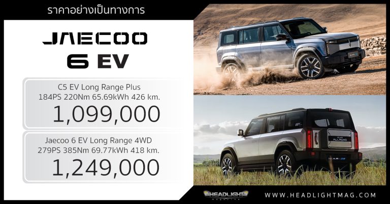 ราคาอย่างเป็นทางการ + เทียบสเป็ค JAECOO 6 EV : 1,099,000 – 1,249,000 บาท | Off-road SUV ขุมพลังไฟฟ้า