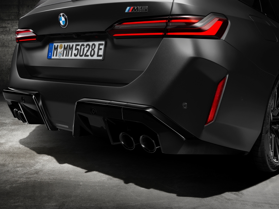 งานออกแบบภายนอกเป็นการพัฒนาต่อยอดจาก 5-series เจเนอเรชั่นปัจจุบันตัวถังแวกอนรหัสตัวถัง G61 ด้วยการเสริมความดุดันที่บริเวณกันชนหน้า อุดมไปด้วยช่องดักลมที่มีเส้นสายโฉบเฉี่ยว พร้อมด้วยสเกิร์ตหน้าขนาดพอเหมาะ ขณะที่ด้านท้ายมาพร้อมปลายท่อไอเสียขนาดใหญ่แบบ 4 ช่อง เข้าชุดกันกับกันชนท้ายออกแบบให้ติดตั้งแผ่นดิฟฟิวเซอร์ทรงอลังการงานสร้าง ทั้งหมดนี้ยังไม่รวมโป่งซุ้มล้อที่ช่วยขยายขนาดความกว้างตัวถังจากรุ่นปกติอีก 3 นิ้วที่ด้านหน้า และ 1.9 นิ้วที่ด้านหลัง มาพร้อมทางเลือกสีตัวถัง 9 สี พร้อมสีเฉดพิเศษจากแผนก BMW Individual ให้เสียเงินเพิ่มเพื่อสร้างความแตกต่าง พร้อมกระจังหน้าแบบเรืองแสงได้