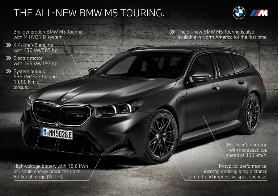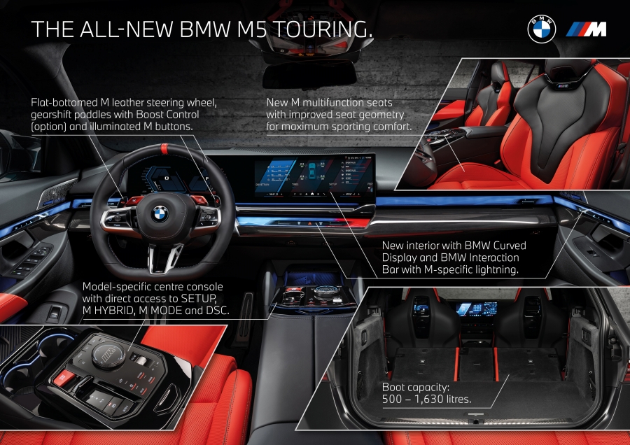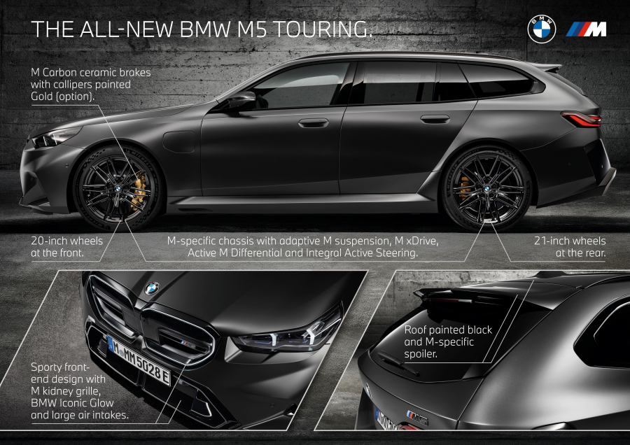 และแล้วก็ถึงเวลาของการเปิดตัวรถสำหรับพ่อบ้านเท้าหนักถึงหนักมากอย่าง M5 Touring ที่งานวิศวกรรมร่วมกันกับรุ่นซีดานที่เปิดตัวไปเมื่อเดือนมิถุนายน 2024 ที่ผ่านมา จุดเด่นของรุ่นแวกอนที่เหนือกว่ารุ่นซีดานอย่างไม่น่าเชื่อ ได้แก่การรกะจายน้ำหนักหน้า-หลัง ที่อัตราส่วนใกล้เคียง 50:50 ถึงแม้ว่าจะมีน้ำหนักตัวถังรวมมากกว่าอยู่ 63 กิโลกรัม รวมเป็น 2,508 กิโลกรัม ก็ตาม