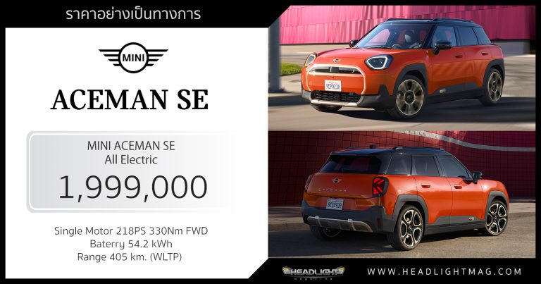 ราคาอย่างเป็นทางการ MINI ACEMAN SE (เอซแมน) MINI Aceman … อ่านเพิ่มเติม ราคาอย่างเป็นทางการ MINI ACEMAN SE : 1,999,000 บาท | ขุมพลังไฟฟ้า วิ่งไกลสุด 405 km. (WLTP)
