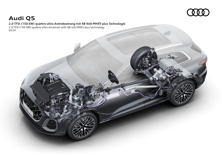 ขุมพลังยังคงใช้ร่วมกันกับ A5 ใหม่ที่เพิ่งจะเปิดตัวไปหมาดๆ ในฐานะรถที่ใช้งานวิศวกรรมพื้นฐานเดียวกัน ซึ่ง Audi จะเน้นไปที่ขุมพลัง Mild-hybrid 48-volt พร้อมแบตเตอรี่ความจุ 1.7 kWh เป็นหลัก ขณะที่ขุมพลัง plug-in hybrid จะตามมาในภายหลังช่วงปี 2025 ซึ่งจะมาพร้อมระยะทางในโหมด EV เพิ่มขึ้นเป็น 80 กิโลเมตร