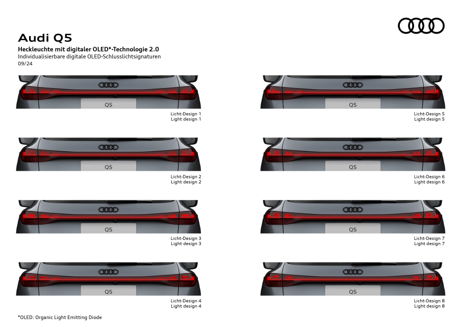 Audi ยังได้แนะนำไฟโปรเจคเตอร์ในสปอยเลอร์หลังเป็นครั้งแรกในยุโรป ซึ่งจะฉายภาพกราฟิกลงบนกระจกบังลมหลัง เพื่อเพิ่มพื้นที่ไฟเบรก ซึ่งจะทำให้รถคันหลังได้รับการเตือนอย่างชัดเจนยิ่งขึ้น