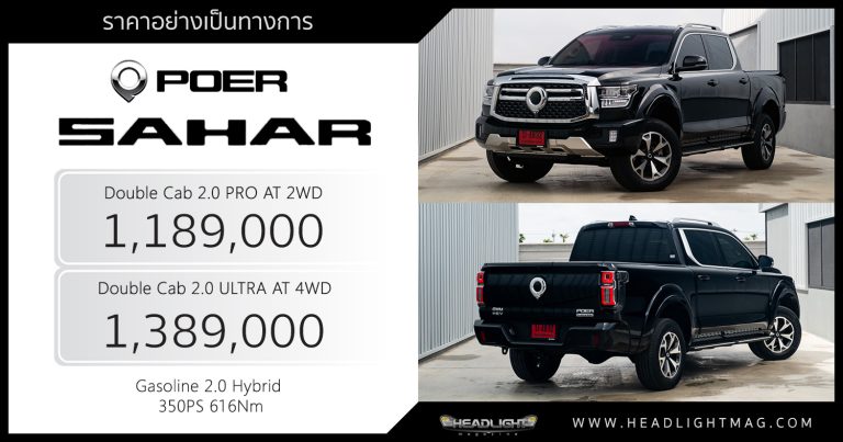 ราคาอย่างเป็นทางการ GWM POER SAHAR HEV Double Cab 2.0 P … อ่านเพิ่มเติม ราคาอย่างเป็นทางการ GWM POER SAHAR HEV : 1,189,000 – 1,389,000 บาท | เบนซิน 2.0 Turbo Hybrid 350 แรงม้า