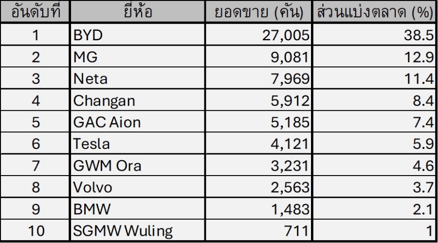 ในประเทศไทยยอดจดทะเบียนรถยนต์ไฟฟ้าล้วน (EV) ในปี 2024 อยู่ที่ 70,137 คัน ลดลง 8.1% เมื่อเทียบกับปีก่อนหน้า โดยมีอัตราการเข้าถึงตลาด 14.0% จากแบรนด์ที่ติด 10 อันดับแรก มาจากจีนถึง 7 แบรนด์ โดย BYD ครองอันดับหนึ่งด้วยยอดขาย 27,005 คัน คิดเป็น 38.5% ของส่วนแบ่งตลาด
