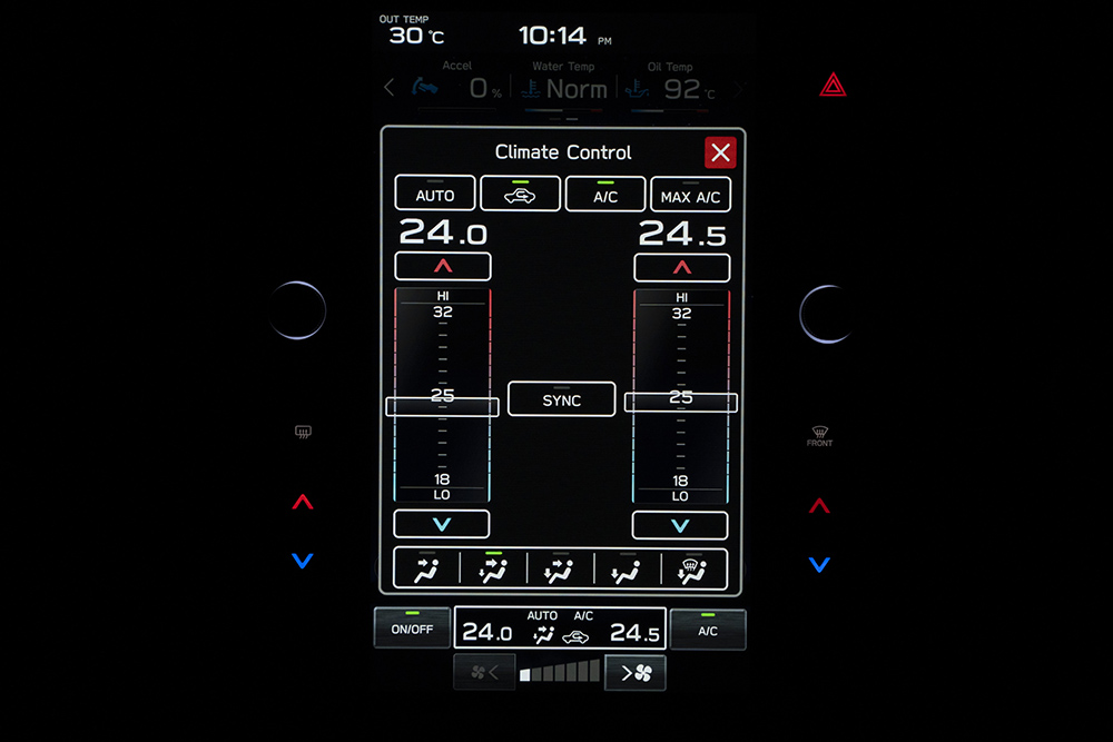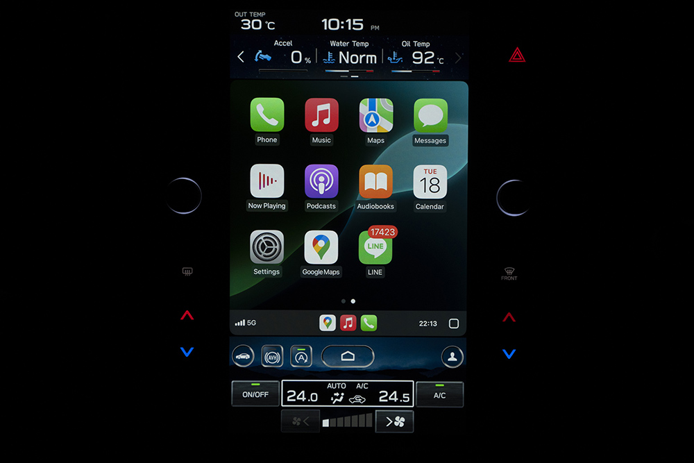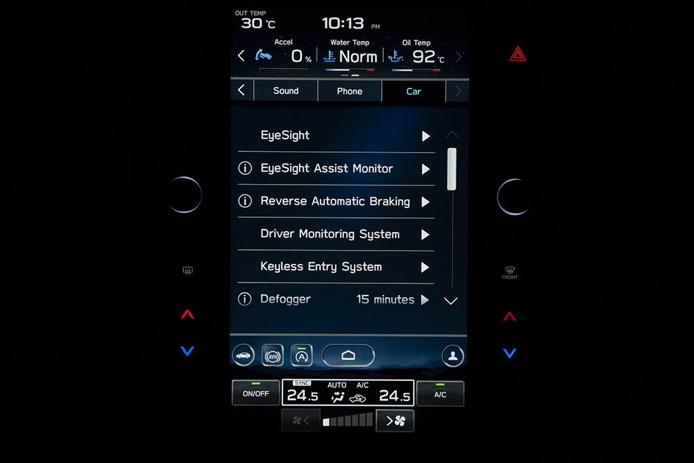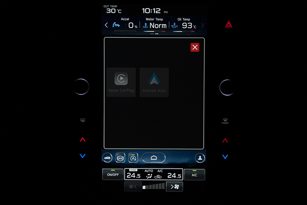 เครื่องยนต์ FA24 เบนซิน 4 สูบนอน BOXER DOHC 16 วาล์ว 2.4 ลิตร 2,387 ซีซี กระบอกสูบ x ช่วงชัก : 94.0 x 86.0 มิลลิเมตร กำลังอัด 10.6 : 1 จ่ายเชื้อเพลิงแบบ Direct-injection พ่วงระบบอัดอากาศ Turbochared กำลังสูงสุด 275 แรงม้า (PS) ที่ 5,600 รอบ/นาที แรงบิดสูงสุด 350 นิวตันเมตร ที่ 2,000 – 5,200 รอบ/นาที จับคู่เกียร์อัตโนมัติอัตราทดแปรผัน Sports Lineartronic CVT 8 จังหวะ ขับเคลื่อน 4 ล้อ แบบ Symmetrical AWD ความจุถังน้ำมัน : 63 ลิตร