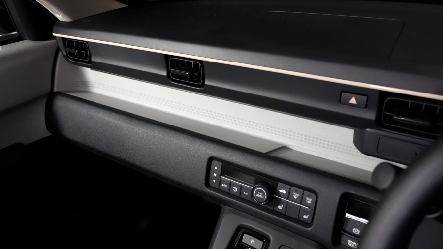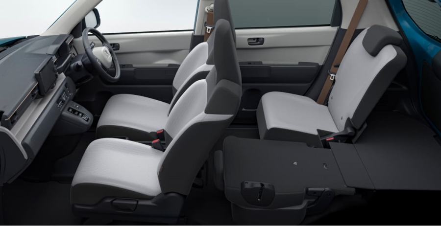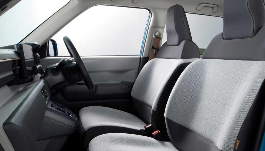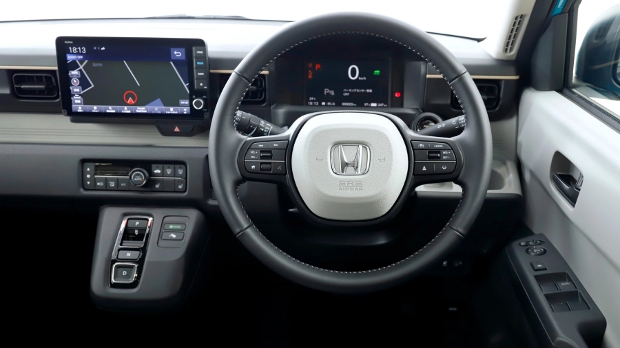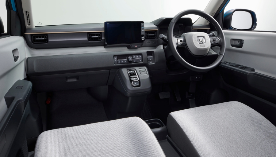 ภายในห้องโดยสารของ N-One e: ดูเรียบง่ายแต่ทันสมัย มีปุ่มกดแบบและแป้นหมุนปรับเสียงบนหน้าจอ Infotainment ที่ใช้งานสะดวก มีช่องวางสมาร์ทโฟนใต้หน้าจอกลาง (ไม่มีระบบชาร์จไร้สาย) และเบาะหลังพับได้แบบ 50:50 เพื่อเพิ่มพื้นที่เก็บสัมภาระ โดยคอนโซลเกียร์แบบปุ่มกดมีลักษณะคล้ายกับรถ Honda รุ่นตลาดทั่วไปในยุโรปและอเมริกา พร้อมปุ่มเปิดโหมดขับขี่แบบ one-pedal ที่อยู่ใกล้มือ