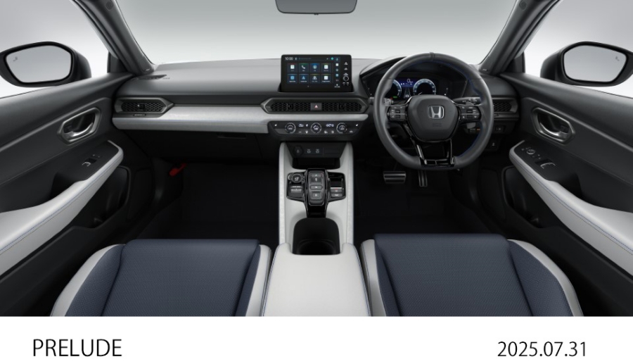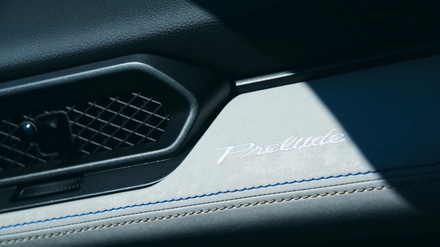 ภายในห้องโดยสารยังคงถ่ายทอดแนวคิด “Unlimited Glide” ผ่านบรรยากาศที่โปร่งสบายและหรูหราทันสมัย พร้อมโทนสีขาวสดใสตัดกับน้ำเงินเข้ม แผงคอนโซลหน้าตกแต่งด้วยพื้นผิวสีขาวเฉดอ่อนที่ชวนสัมผัส เพิ่มความพิเศษด้วยโลโก้ Prelude ปักอยู่ฝั่งผู้โดยสาร