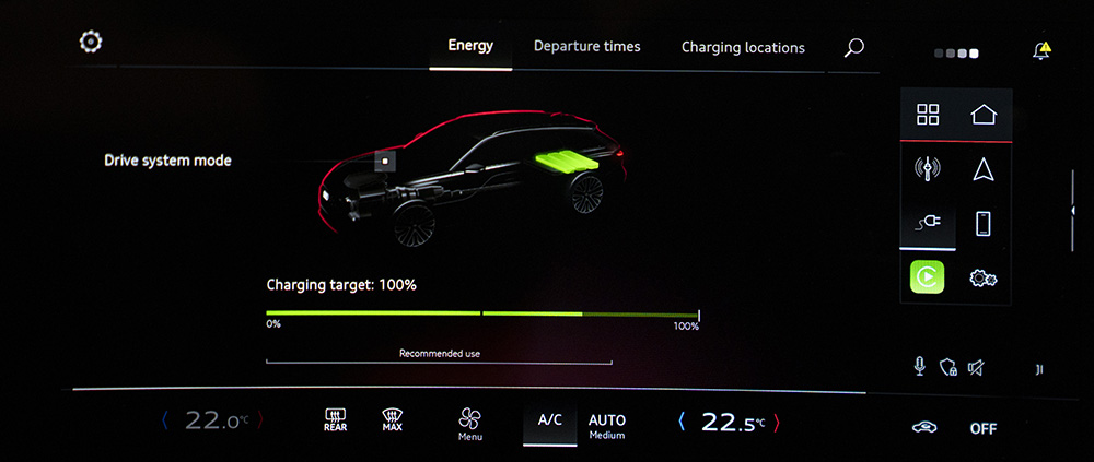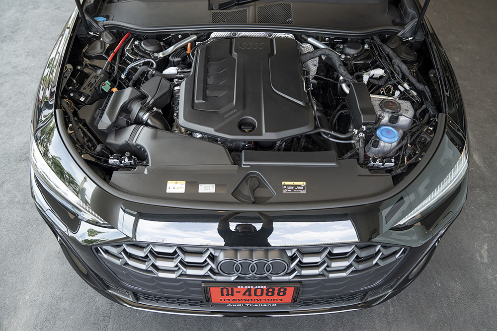 เครื่องยนต์เบนซิน 4 สูบ DOHC 16 วาล์ว 2.0 ลิตร 1,984 ซีซี ฉีดจ่ายเชื้อเพลิงแบบ Direct-injection พ่วงระบบอัดอากาศ Turbocharged กำลังสูงสุด 185 กิโลวัตต์ หรือ 252 แรงม้า (PS) ที่ 5,000 – 6,500 รอบ/นาที แรงบิดสูงสุด 380 นิวตันเมตร ที่ 1,600 – 4,500 รอบ/นาที ทำงานร่วมกับมอเตอร์ไฟฟ้า กำลังสูงสุด 143 แรงม้า (PS) แรงบิดสูงสุด 350 นิวตันเมตร รวมพละกำลังสูงสุดทั้งระบบ 367 แรงม้า แรงบิดสูงสุด 500 นิวตันเมตร พ่วงด้วยแบตเตอรี่ Lithium-ion ความจุ 25.9 kWh รองรับการชาร์จด้วยไฟฟ้ากระแสสลับ AC สูงสุด 7.4 kW ส่งกำลังด้วยเกียร์อัตโนมัติ S Tronic 7 จังหวะ ขับเคลื่อน 4 ล้อ quattro ความจุถังน้ำมัน 50 ลิตร