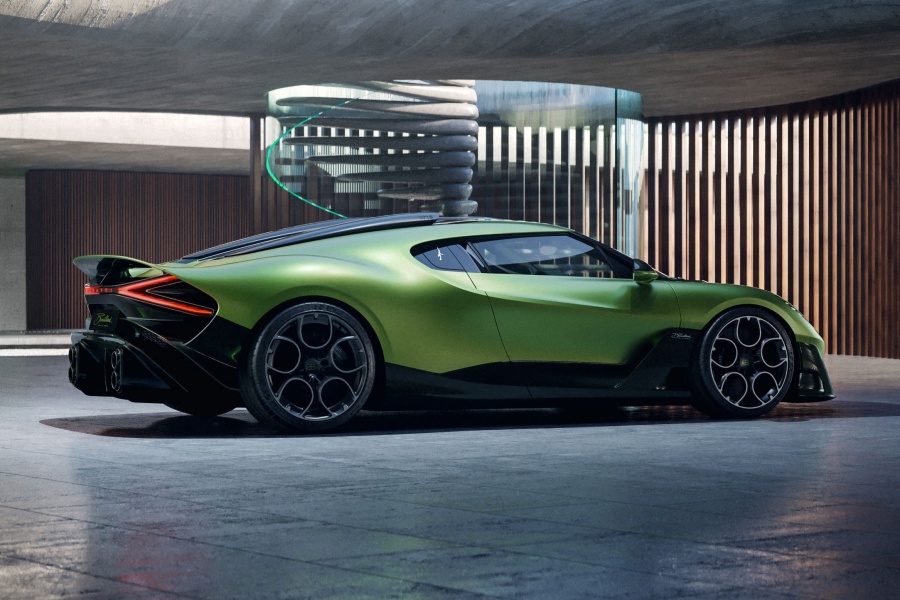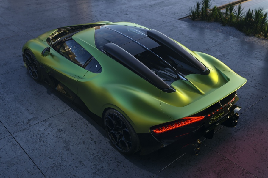 ภายในใช้วัสดุสั่งทอพิเศษจาก Paris ลายทาร์ทัน ผสานคาร์บอนไฟเบอร์สีเขียวและอะลูมิเนียมกลึงชิ้นเดียว หลังคากระจกพาโนรามามอบบรรยากาศโปร่งสว่างเหมือนโบสถ์ใหญ่ เส้นสันกลางตัวรถไหลต่อเนื่องจากภายนอกสู่ภายใน ลวดลายม้าปักอย่างประณีตบนประตูและพนักพิง เบาะนั่งออกแบบรูปทรงและการหุ้มหนังตามสรีระเจ้าของ คันเกียร์อลูมิเนียมฝังงานประติมากรรมม้าจิ๋วในแก้วคริสตัล