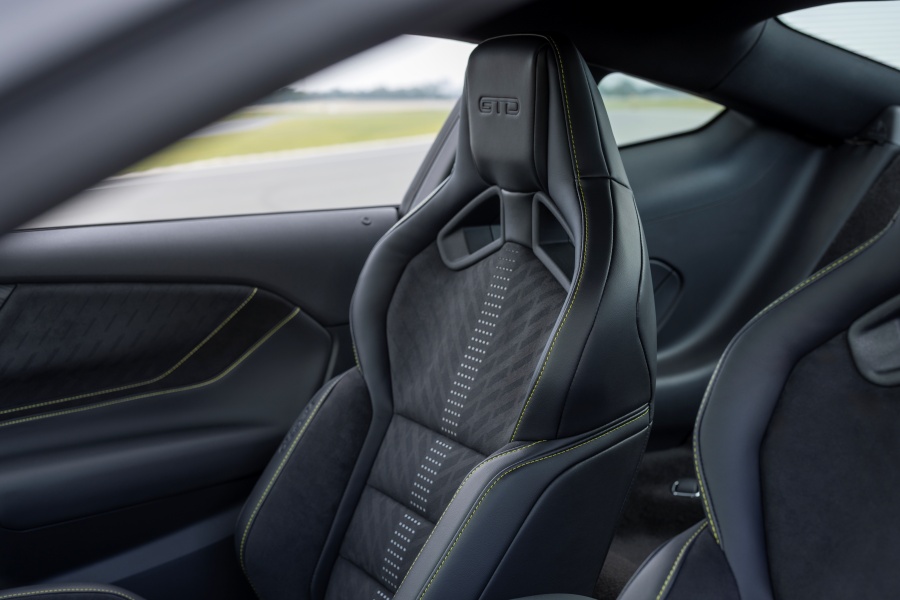 ภายในห้องโดยสารของ Mustang GTD Liquid Carbon ถูกออกแบบให้มีเอกลักษณ์เฉพาะ ด้วยการผสมผสานวัสดุหนังสีดำ Dinamica Microfiber Suede และการเดินตะเข็บด้วยด้าย Hyper Lime สีเขียวสด ที่บริเวณเบาะนั่ง แผงประตู คอนโซลกลาง แผงหน้าปัด และพวงมาลัย ตอกย้ำความสปอร์ตและความพรีเมียมไปพร้อมกัน เบาะนั่งยังมาพร้อม ดีไซน์ Gradient สะท้อนแสงตรงกลาง ช่วยเพิ่มลูกเล่นให้กับบรรยากาศภายในที่มุ่งเน้นสมาธิและประสิทธิภาพในการขับขี่
