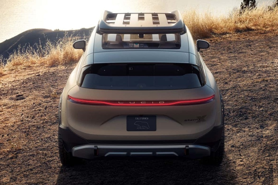 นอกจากนี้ Lucid ยังเพิ่มลูกเล่นที่แตกต่าง เช่น แร็คหลังคาพร้อมไฟ LED กล่องเก็บสัมภาระบนหลังคา (roof box) และสีตัวถังพิเศษสีน้ำตาลด้าน Astral Drift Satin ที่มาพร้อมลวดลายกราฟิกอ้างอิงจากภูมิประเทศจริงของ Big Spur และ Death Valley ซึ่งสะท้อนแนวคิดการสำรวจและการผจญภัยในธรรมชาติ