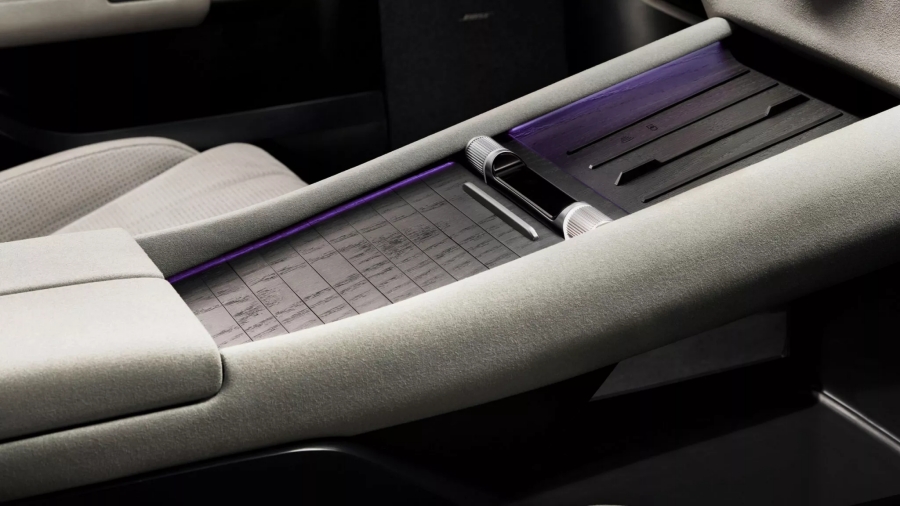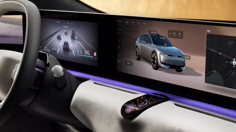 ภายในห้องโดยสารโดดเด่นด้วยหน้าจอขนาดยักษ์ 59 นิ้ว ครอบคลุมเต็มความกว้างของแดชบอร์ด แสดงผลทั้งอินโฟเทนเมนต์ มาตรวัด และกล้องกระจกมองข้าง Digital ดีไซน์โดยรวมออกแบบให้เรียบหรูในสไตล์มินิมอล ใช้วัสดุหนังและ Alcantara เกรดพรีเมียม พร้อมที่ชาร์จสมาร์ทโฟนไร้สายคู่