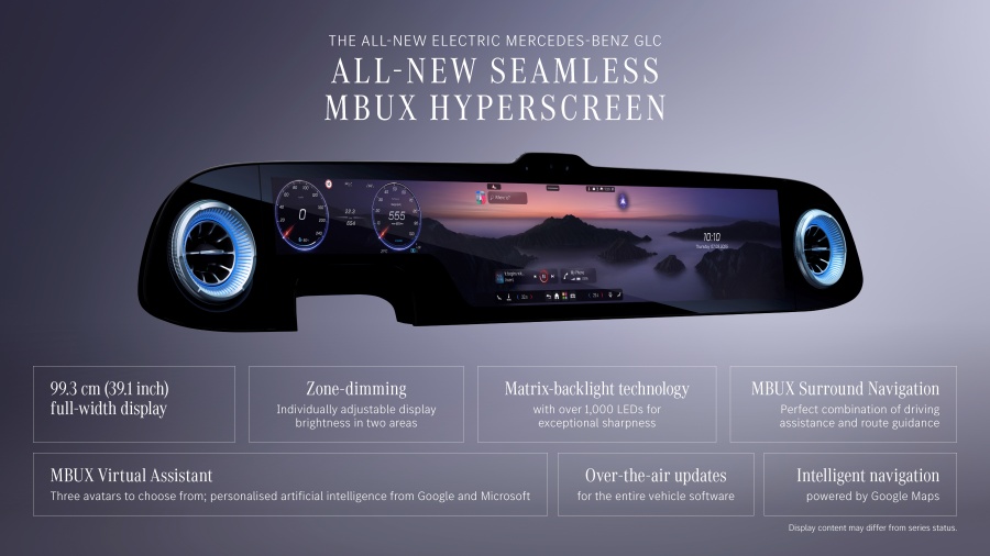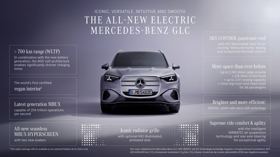 เมื่อวันที่ 8 กันยายน 2025 Mercedes-Benz เปิดตัว GLC with EQ technology แทนที่ EQC ที่เริ่มไม่ประสบความสำเร็จด้านยอดขาย และรับน้องใหม่อย่างทันทีหลังจาก BMW เปิดตัว iX3 ได้เพียงข้ามสุดสัปดาห์ มาพร้อมดีไซน์ภายนอกโดดเด่นด้วยกระจังหน้าสุด Iconic ได้รับการตีความใหม่จากจุดกำเนิดของยุครถยนต์สันดาป ให้กลายเป็นงานศิลป์ไฮเทคที่มีไฟเรืองแสงตามสมัยนิยม (BMW ก็ใช้แนวทางนี้กับ iX3 ใหม่เช่นเดียวกัน) โดยมาพร้อมกรอบโครเมียมกว้าง พร้อมโครงสร้างตะแกรงโทนกระจกสีรมควันและไฟตกแต่งรอบขอบด้านนอก