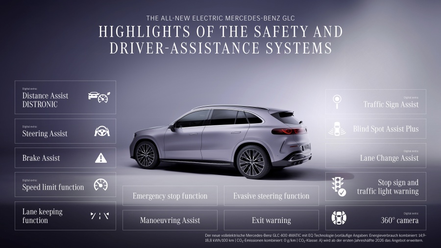 ด้านสมรรถนะ GLC ใหม่ไฟฟ้าติดตั้งระบบเบรก One-Box ที่ผสานการหน่วงพลังงานและการเบรกจริงได้อย่างราบรื่น มั่นใจ และต่อเนื่อง พร้อมระบบช่วยขับขี่ MB.DRIVE ที่ใช้กล้อง 10 ตัว เรดาร์อีก 5 ตัว และเซนเซอร์อัลตราโซนิก 12 ตัว เพื่อยกระดับความปลอดภัย ช่วงล่างถุงลมอัจฉริยะจาก S-Class และระบบเลี้ยวล้อหลัง 4.5 องศาเสริมทั้งความสบายและความคล่องตัว