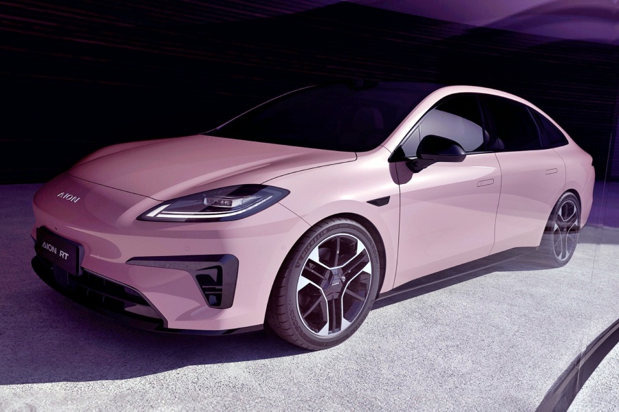 ดีไซน์ภายนอกของ Aion RT ยังคงสะท้อนคอนเซปต์ “Velociraptor” ด้วยเส้นสายโค้งมนที่ทำให้ตัวถังมีมัดกล้ามและรูปทรงสปอร์ต ด้านหน้ามีเส้นสายแบบ Minimal เพื่อลดแรงเสียดทานอากาศ เสริมด้วยช่องดักลมขนาดใหญ่และเซ็นเซอร์ LiDAR ที่ติดตั้งอย่างแนบเนียน ด้านข้างตัวรถออกแบบทรงคูเป้พร้อมท้ายลาดแบบ Fastback พร้อมมือจับประตูซ่อนแบบเรียบเนียนเข้ากับตัวถัง โดยตัวรถมีขนาดยาว 4,865 มม. กว้าง 1,875 มม. สูง 1,520 มม. และระยะฐานล้อ 2,775 มม. พร้อมสัมประสิทธิ์แรงเสียดทานอากาศต่ำเพียง 0.208Cd ซึ่งถือว่าดีที่สุดรุ่นหนึ่งในกลุ่ม พร้อมตัวเลือกสีสันภายนอกถึง 7 สี