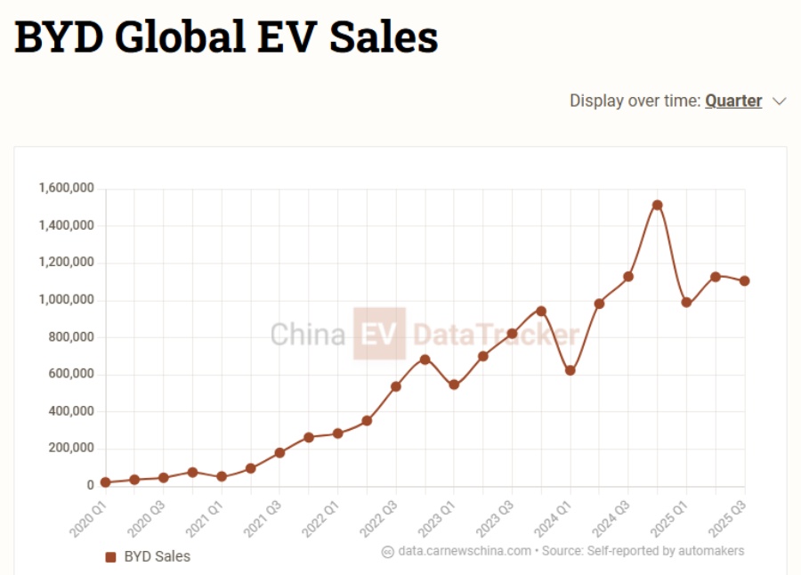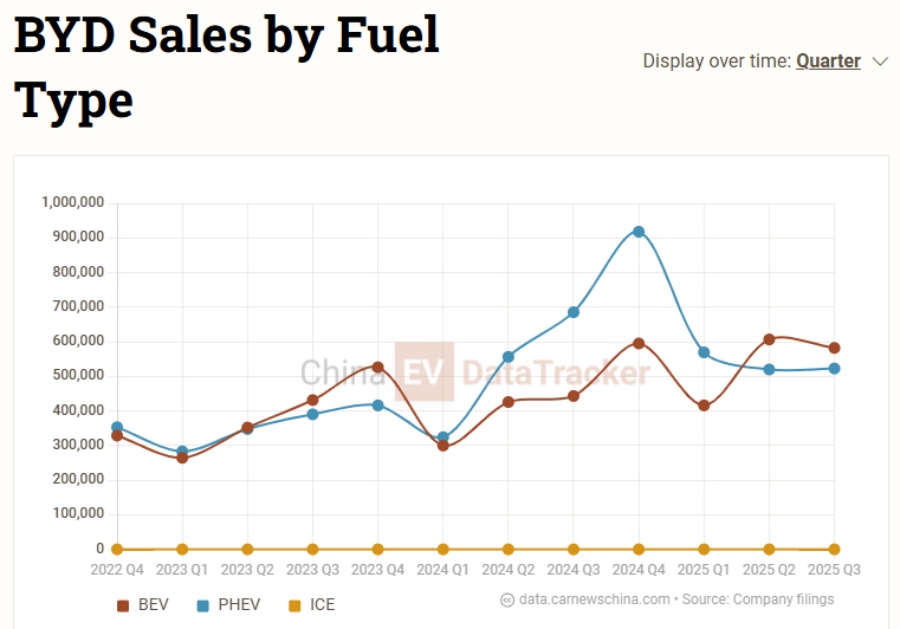 ภาพรวมยอดขายโดยรวมในไตรมาส 3 ปี 2025 BYD Group มียอดขายทั่วโลก 1,105,591 คัน ลดลง 2.1% เมื่อเทียบกับปีก่อนหน้า ถือเป็นการปรับตัวลงรายไตรมาสครั้งแรกนับตั้งแต่ปี 2020 โดยแบรนด์ BYD ลดลง 4% ขณะที่ยอดขาย PHEV ลดลง 23.7% เหลือ 523,069 คัน แต่รถ BEV เติบโต 31.4% อยู่ที่ 582,522 คัน
