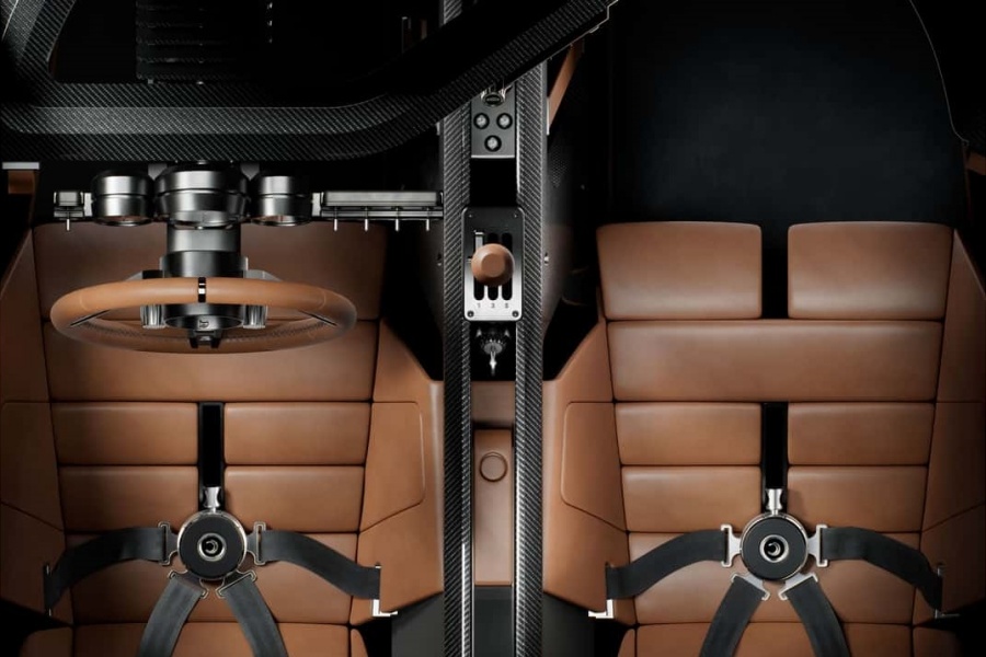 ภายในห้องโดยสารสะท้อนแนวคิด “Analog is Art” ได้อย่างชัดเจน ไม่มีหน้าจอใดๆ มีเพียงมาตรวัดเข็ม 3 วงหลังพวงมาลัยหุ้มหนังแท้ที่มีปุ่มเพียงสองปุ่ม ได้แก่ ปุ่มสตาร์ทเครื่องและโหมดการขับขี่ เบาะนั่งเป็นแบบปรับไม่ได้ แต่สามารถปรับระยะของแป้นเหยียบ พวงมาลัย และคันเกียร์ได้ตามความเหมาะสม ลักษณะเดียวกับรถแข่ง เพื่อให้เบาะนั่งผู้ขับขี่มีความแน่นหน้ามากที่สุด โดยคันเกียร์สามารถขยับในแนวยาวได้ถึง 3.1 นิ้ว ห้องโดยสารตกแต่งด้วยวัสดุคาร์บอนไฟเบอร์เปลือย ผสมผสานวัสดุไทเทเนียมและอะลูมิเนียมแท่งตัน ส่วนเบาะนั่งหุ้มด้วยหนัง Connolly และ Alcantara พร้อมทางเลือกให้ลูกค้าปรับแต่งเองได้