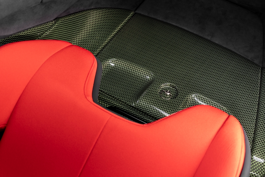 มุมมองด้านข้างของตัวรถโดดเด่นด้วยช่องรับอากาศแบบ NACA duct พร้อมแผ่นคาร์บอนไฟเบอร์ทรงสามเหลี่ยมขนาดใหญ่ มาพร้อมเส้นสายเฉียบคมที่ซุ้มล้อ ประตู และฝาครอบเครื่องยนต์ ออกแบบให้ดูมีมัดกล้าม