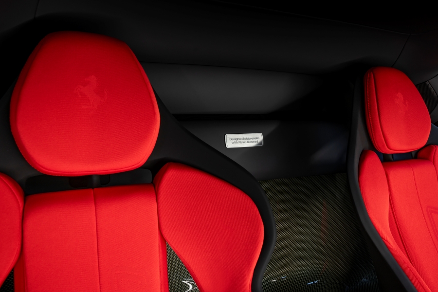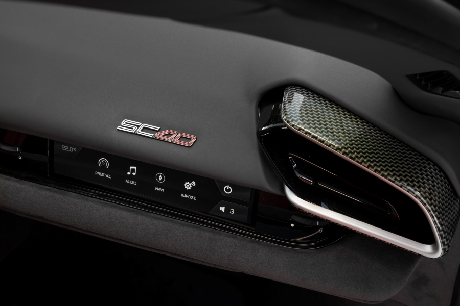 ภายในห้องโดยสาร SC40 สะท้อนกลิ่นอายของ F40 ด้วยการใช้วัสดุคาร์บอน-เคฟลาร์ (Carbon-Kevlar) ที่ได้รับการพัฒนาใหม่สำหรับโปรเจกต์นี้บริเวณพื้นห้องโดยสาร ที่วางเท้า บริเวณด้านหลังเบาะ และพรมปูตัวถังบางส่วน รวมถึงพวงมาลัยและส่วนตกแต่งของคอนโซลกลาง วัสดุเดียวกันนี้ยังถูกใช้ในห้องเครื่องและช่องเก็บสัมภาระ การตกแต่งเบาะเลือกใช้วัสดุ Alcantara สีเทาเข้ม (Charcoal Alcantara®) ผสมกับผ้าทอเทคนิคสีแดงลวดลายพิเศษ พร้อมตราม้าลำพองและโลโก้ SC40 ที่ทอเข้ากับผ้าอย่างประณีต