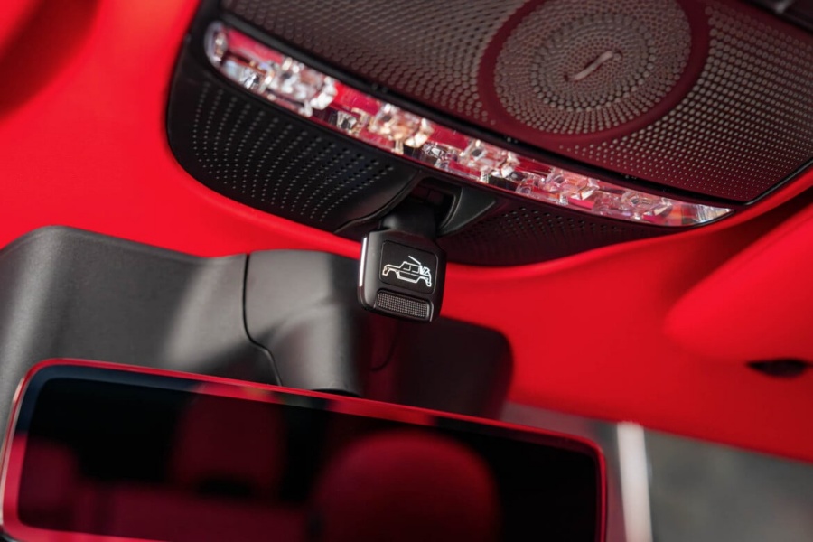 ห้องโดยสารถูกตกแต่งด้วยวัสดุหนังสีแดงสดแทบทุกจุด ตั้งแต่เบาะนั่ง พวงมาลัย แผงประตู ไปจนถึงเพดาน พร้อมลวดลายคาร์บอนไฟเบอร์ เพิ่มความสะดวกสบายด้วยระบบ Airscarf ที่เป่าลมอุ่นบริเวณคอผู้โดยสารหน้าสำหรับการขับแบบเปิดหลังคา