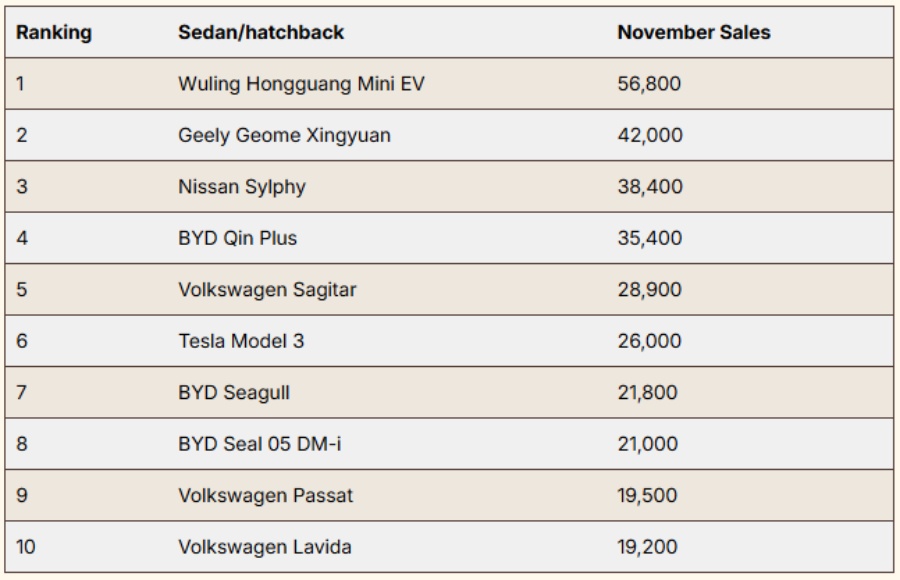 ขณะที่กลุ่มรถ Sedan / Hatchback ที่ขายดีที่สุด 10 อันดับแรก ยังพบว่ามีรถเครื่องยนต์สันดาปล้วนติดอันดับถึง 4 รุ่น ได้แก่ Nissan Sylphy Volkswagen Sagitar Volkswagen Passat และ Volkswagen Lavida