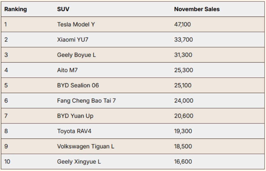 หันกลับมาที่กลุ่ม SUV ดาวเด่นยังคงเป็น Tesla Model Y ที่มียอดขาย 47,100 คัน เพิ่มขึ้นถึง 141.9% จากเดือนก่อน ทำให้ยอดสะสมทั้งปี 2025 อยู่ที่ 359,500 คัน ขณะที่ Xiaomi YU7 มียอดขาย 33,700 คัน เพิ่มขึ้นเล็กน้อยจากเดือนตุลาคม 0.2% และมียอดขายสะสมตลอดปี 2025 ถึง 114,600 คัน (ม.ค.–พ.ย.)