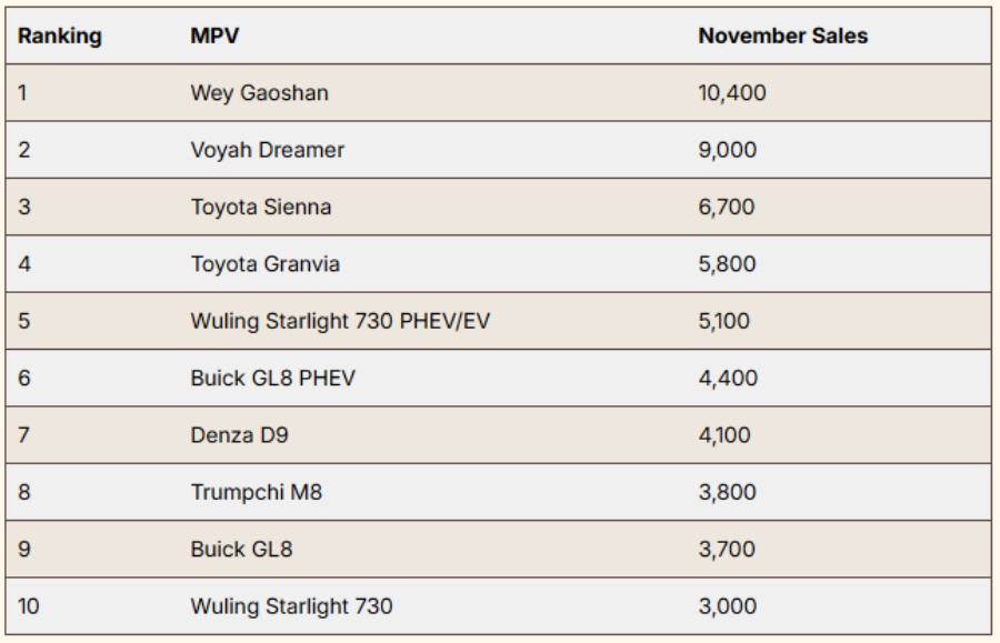 อย่างไรก็ตามตลาด MPV กลับเกิดการเปลี่ยนแปลงครั้งใหญ่ เมื่อ Wey Gaoshan ครองอันดับหนึ่งต่อเนื่องนานถึง 3 เดือน (ก.ย.–พ.ย.) ด้วยยอดขาย 10,400 คันในเดือนพฤศจิกายน กลายเป็น MPV รุ่นแรกของปีนี้ที่ทำยอดขายเกิน 10,000 คันต่อเดือน แซงหน้า Toyota Sienna และ Denza D9 ได้แบบน่าตกใจ