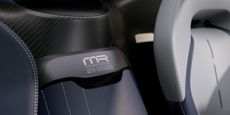 ภายในห้องโดยสารมาพร้อมแผงประตูถูกปักลายเฉพาะ ที่บอกเล่าสามช่วงเวลาสำคัญในประวัติศาสตร์ Rimac ได้แก่ ยุคโรงรถ การเปิดตัว Concept_One และช่วงสร้างสถิติระดับโลกกับ Nevera และ Rimac Campus ขณะที่การจัดวางเบาะแบบไม่สมมาตรได้รับแรงบันดาลใจจาก Nevera ส่วนตัวของ Mate Rimac เอง