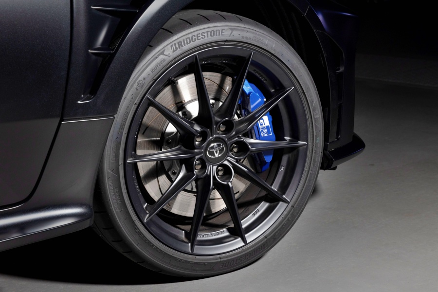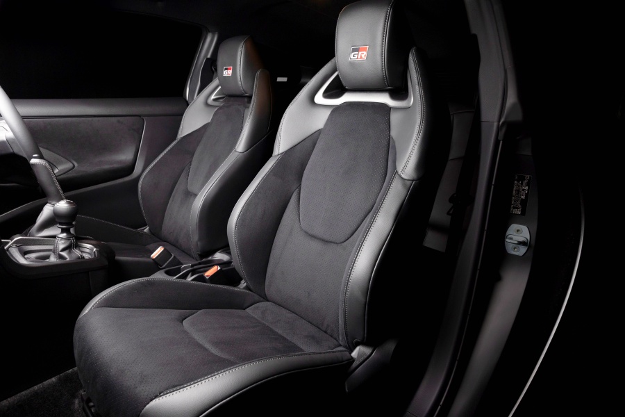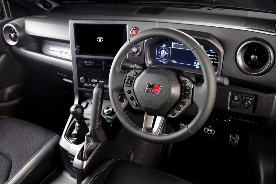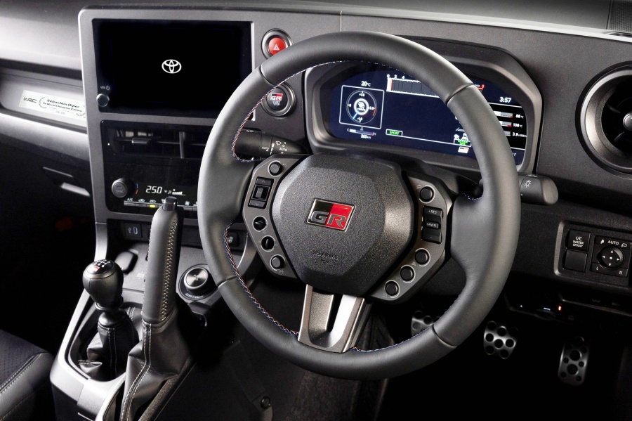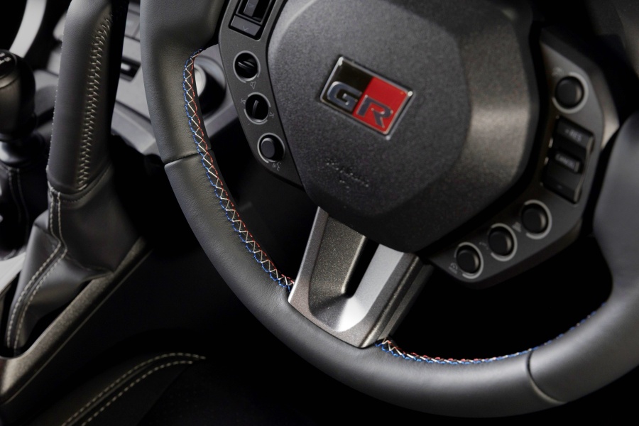 พวงมาลัยที่พัฒนาขึ้นเพื่อการควบคุมในมอเตอร์สปอร์ตโดยเฉพาะ มีเส้นผ่านศูนย์กลางเล็กกว่ารุ่นมาตรฐานเล็กน้อย พร้อมสวิตช์บนพวงมาลัยที่จัดวางแยกอิสระ โดยถ่ายทอดองค์ความรู้จากรถแข่ง GR Yaris Rally2 การเย็บตะเข็บใช้สีฟ้า เทา และแดง สร้างลูกเล่นแบบไตรรงค์