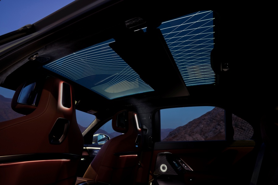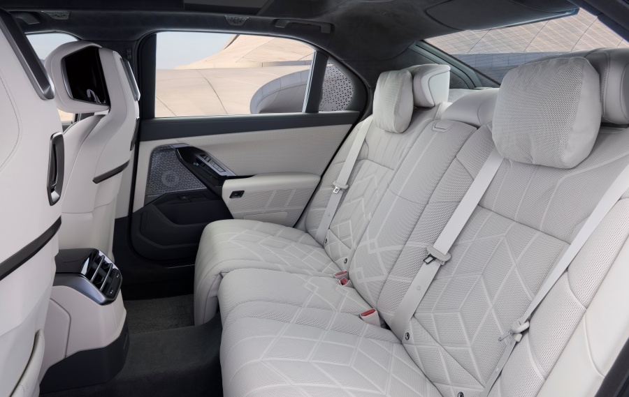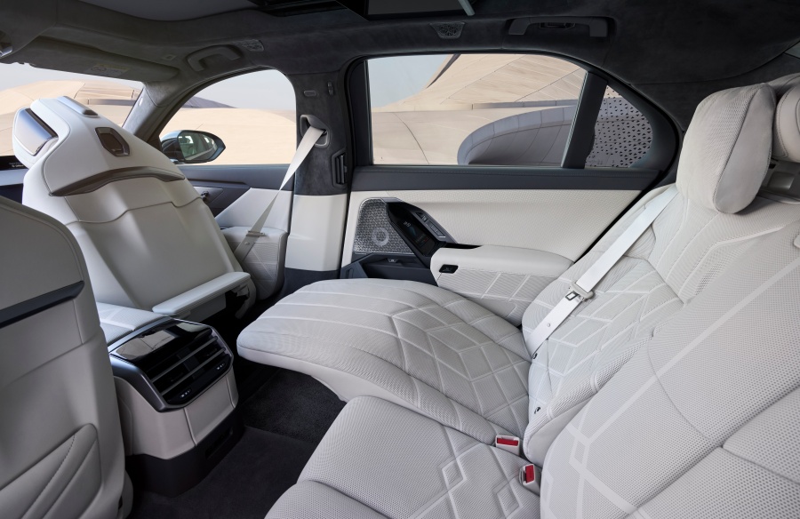 ด้านหลังติดตั้ง Theatre Screen ขนาด 31.3 นิ้ว ความละเอียด 8K พร้อมระบบเสียงรอบทิศทาง เปลี่ยนห้องโดยสารให้เป็น Private Cinema พร้อมม่านบังแดดไฟฟ้าที่ทำงานอัตโนมัติเมื่อเปิดใช้งาน และยังสามารถใช้เป็น Mobile Office สำหรับ Video Conference ได้อีกด้วย เนื่องจากได้เพิ่มกล้อง Webcam ความละเอียดสูง เสริมด้วยระบบ BMW Intelligent Personal Assistant ที่ใช้ AI (ร่วมกับผู้ช่วยส่วนตัว Alexa+) รองรับคำสั่งเสียงแบบสนทนา และการปรับ Personalization ขั้นสูง