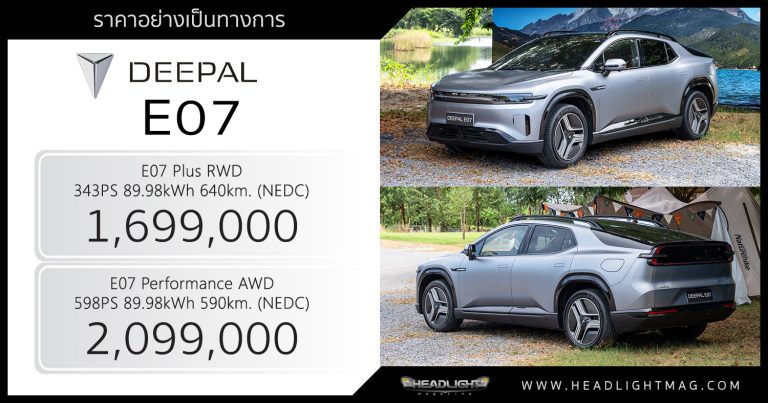 ราคาอย่างเป็นทางการ DEEPAL E07 Deepal E07 Plus RWD : 1, … อ่านเพิ่มเติม ราคาอย่างเป็นทางการ DEEPAL E07 : 1,699,000 – 2,099,000 บาท | 598 แรงม้า แบต 89.98 kWh วิ่งไกลสุด 640 km. (NEDC)
