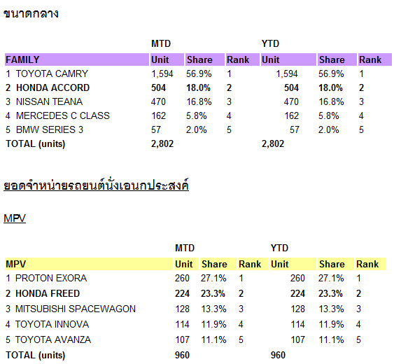 ซิตี้ 2,962 คัน, แจ๊ซ 1,177 คัน, ซีวิค 2,192 คัน, แอคคอร์ด 504 คัน, ฟรีด 224 คัน
