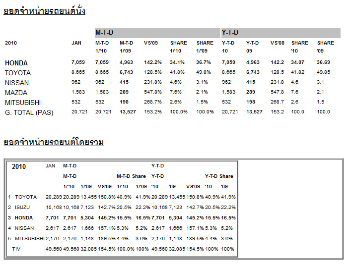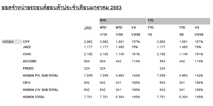 (ประเทศไทย) จำกัด แจ้งยอดจำหน่ายรถยนต์ฮอนด้าในเดือนมกราคม 2553