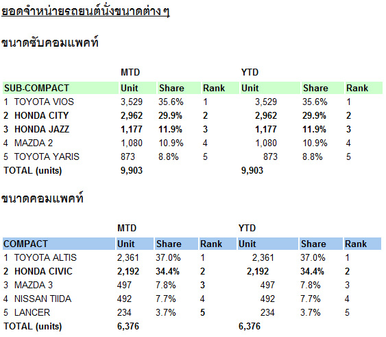 ทั้งนี้ฮอนด้า ซิตี้มีส่วนแบ่งตลาด 29.9% และ ฮอนด้า แจ๊ซ มีส่วนแบ่งตลาด 11.9%
