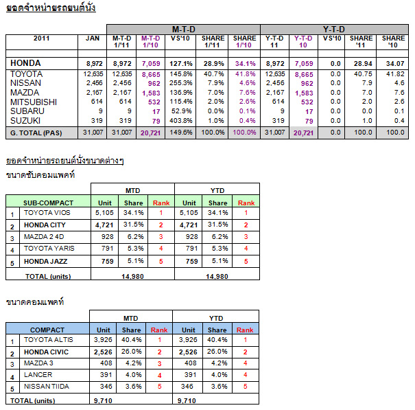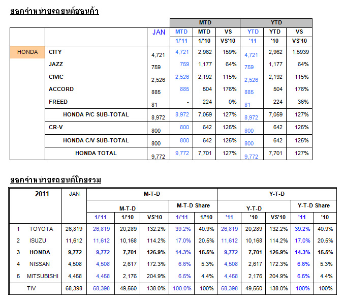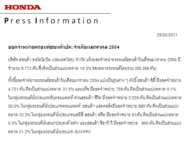 Honda ประกาศยอดขายรถยนต์ในไทย เดือนมกราคม 2011