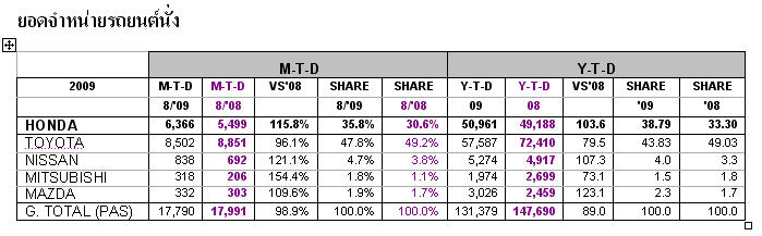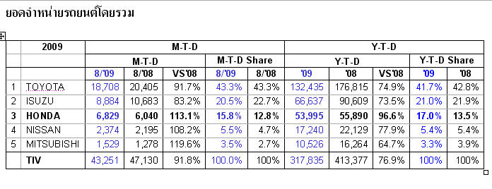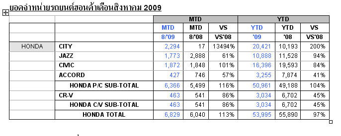 หลังจาก Headlightmag.com ลงยอดขายรวมแยกประเภทของรถจาก Toyota กันไปแล้ว หลายคนน่าจะกำลังรอยอดขายตลาดรถยนต์นั่งที่แจกแจงรายละเอียดแต่ละรุ่นจาก Honda แน่นอน ดังนั้น ยอดขายประจำเดือนสิงหาคม 2009 ผมจึงจัดมิให้เสียครับ