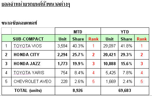 แต่ก็ถือว่า Honda ยังแพ้ Toyota ที่ทำยอดจำหน่ายรถประเภทนี้รวมได้มากกว่าอยู่ดี อันเกิดจากความต้องการที่ไม่มีสิ้นสุดของ Toyota Vios ที่ทำยอดขายมากถึง 3,594 คัน ส่วน Toyota Yaris ยังแพ้ Honda Jazz ไปหลายช่วงตัว