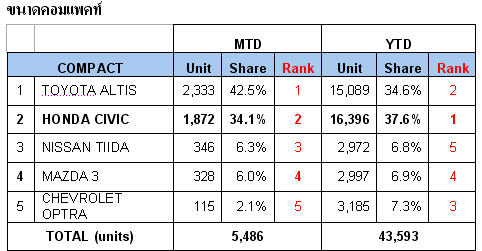แม้ยอดขาย Honda Civic ประจำเดือนสิงหาคมจะแพ้ Toyota Corolla Altis แต่ Hondaไม่ยอมแพ้จึงประกาศยอดขาย Honda Civic ตั้งแต่เดือนมกราคา-สิงหาคม มียอดจำหน่ายรวม 16,396 คัน คิดเป็นส่วนแบ่งตลาด 37.6% ซึ่งมีส่วนแบ่งตลาดสูงสุดในกลุ่มรถยนต์นั่งประเภทคอมแพคท์