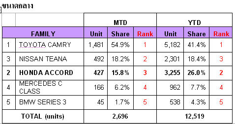 Honda Accord มียอดจำหน่ายรวม 3,255 คัน คิดเป็นส่วนแบ่งตลาด 26.0% ในกลุ่มรถยนต์นั่งแฟมิลี่หรือ D-segment