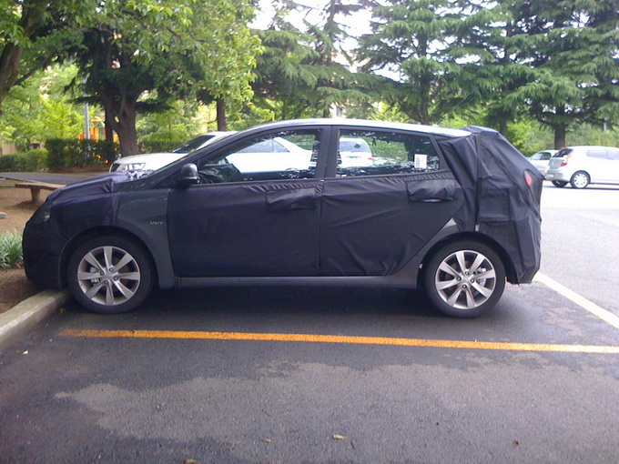 ดูจากรูปทรงด้านข้าง เป็นที่แน่ชัดว่าเส้นสายแนว Fluidic Sculpture แบบเดียวกับที่พบได้ใน Sonata รุ่นใหม่และ Accent ซีดาน(หรือ Verna) ที่เพิ่งเปิดตัวไปในจีน ด้วยการยกสันแนวด้านข้างขึ้นมาอย่างชัดเจนทำให้รถคันเล็กขนาดนี้ดูมีมัดกล้ามดุดันขึ้น ส่วนล้อลายที่เห็นในรถที่ถูกถ่ายภาพมาคันนี้นั้นก็เป็นลายเดียวกับที่สามารถพบได้ในรุ่นซีดานนั่นเอง