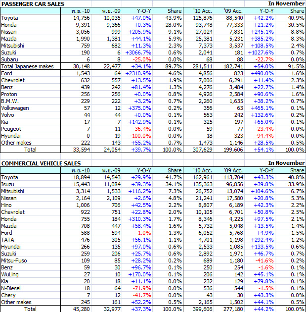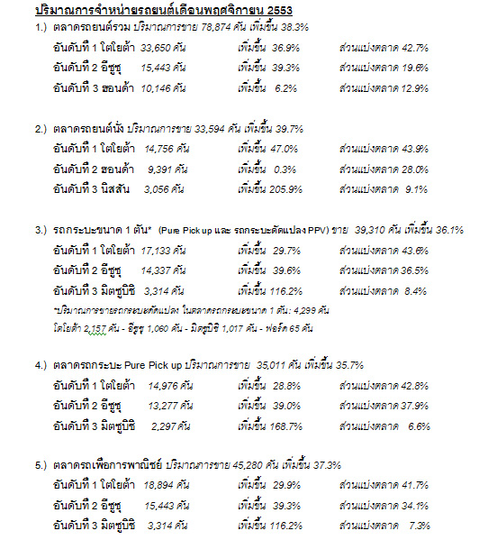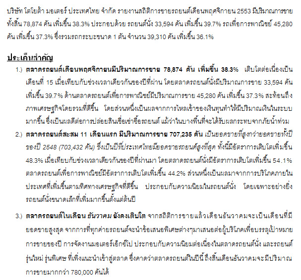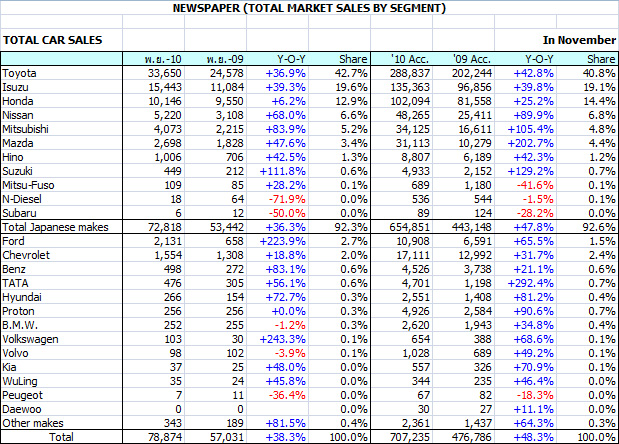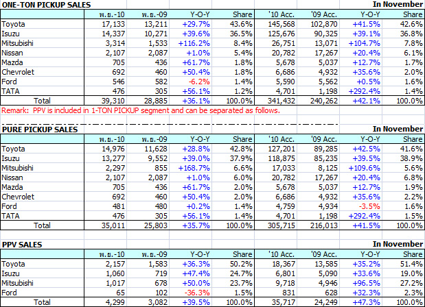 Toyota ประกาศยอดขายรถยนต์ในไทย เดือนพฤศจิกายน 2010